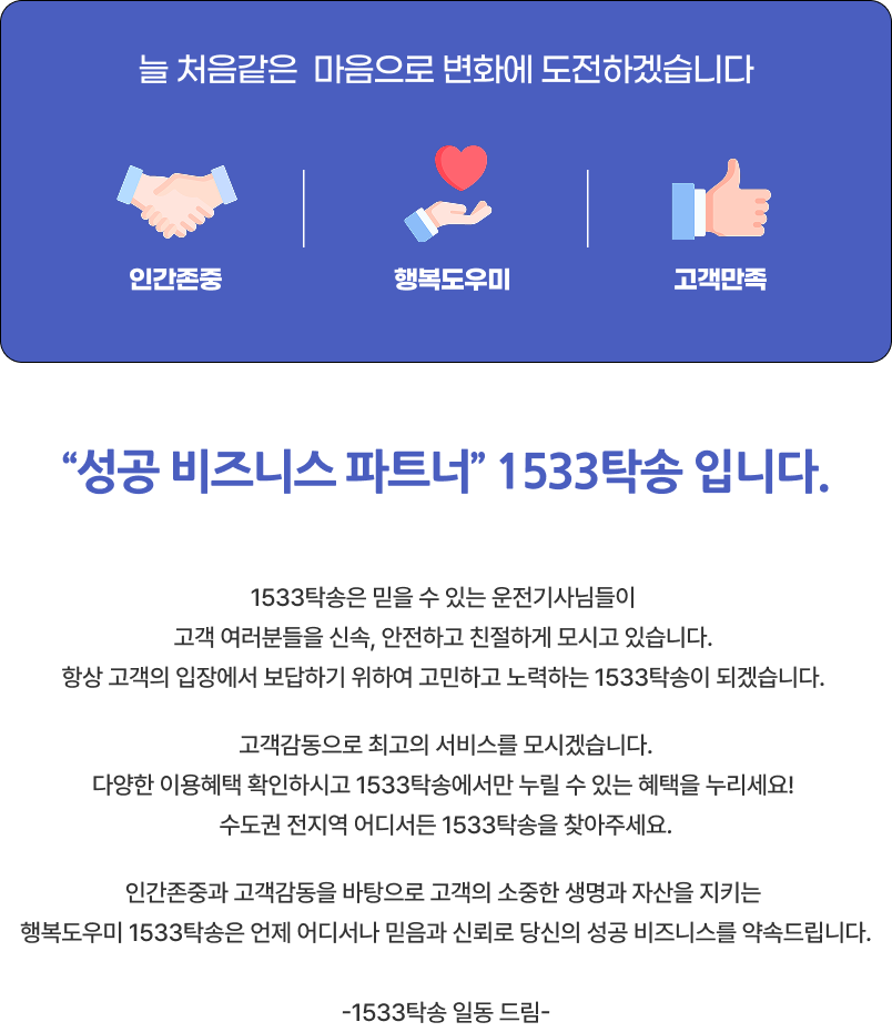 상호 및 대표자 성명 : 1533탁송 (강성희) ㅣ 사업장 주소 : 경기 부천시 부일로 507ㅣ 연락처 : 1855-1577